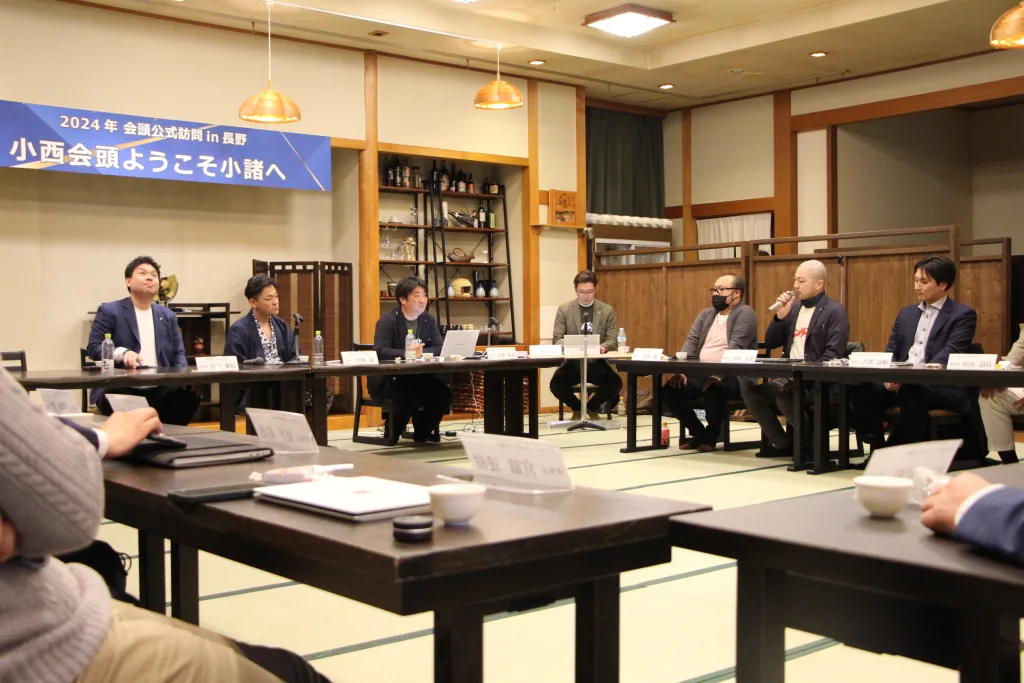 3月22日に小諸市で2024年会頭公式訪問が開催され、本年度の会頭 小西 毅 君を常盤館へお招きして意見交換会と懇親会を17LOMの理事長・専務理事の皆様と一緒に執り行い、親睦を深めました。小西会頭からの要望でネームプレート無し、スーツ禁止ということで気楽な気持ちで臨むつもりではいましたが、小西会頭が登場した際の姿が旅館の浴衣。誰よりもこの場を和ませていただいたことに感謝です。そのお気遣いもあって意見交換会は笑顔の中、スタートして各理事長が抱える悩みや相談事を1つ1つ丁寧に応える小西会頭の姿はとても印象的でした。