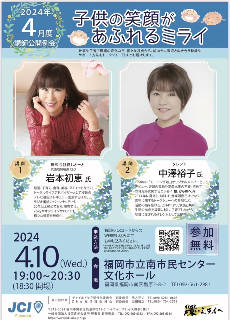 子供の笑顔があふれるミライと題しまして、講師に愛しとーとの岩本初恵様と元モーニング娘の中澤裕子様をお招きし、仕事と子育ての両立など様々な視点から前向きに育児に向き合う秘訣等をお話しいただきます。