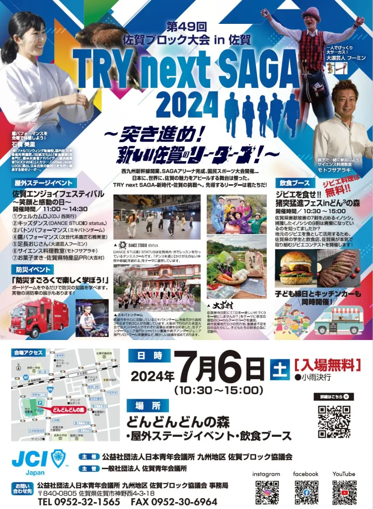 大会テーマ「TRY next SAGA~突き進め!新しい佐賀のリーダーズ!~」のもと、佐賀で活躍するパフォーマーによるステージイベントや、佐賀のジビエ料理の食ブース、お子様も楽しめる縁日ブースもあり佐賀の“素敵なところ”をぎゅっと凝縮&体感できる大会となっています。