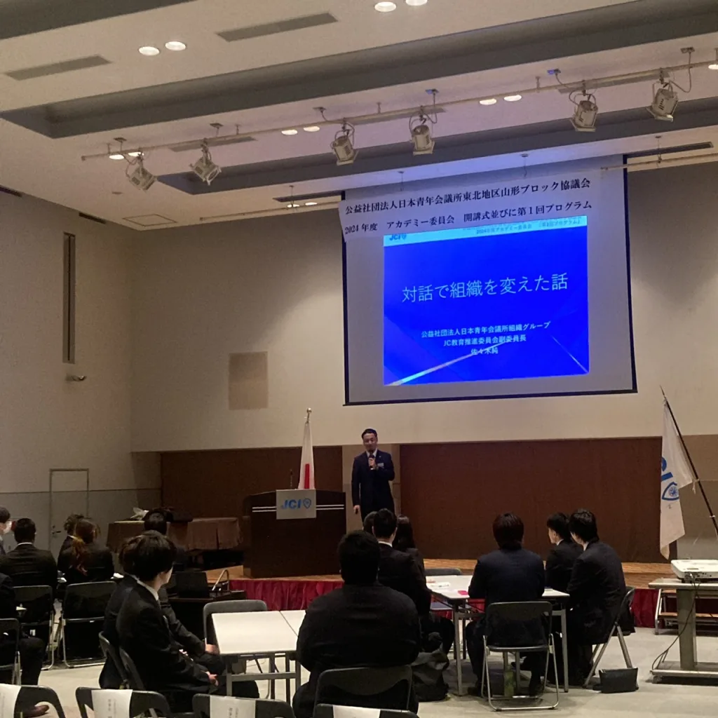 また、第1回プログラムでは、対話を学ぶ内容で、講師に公益社団法人日本青年会議所JC教育推進委員会副委員長の佐々木純君より、ご自身の経験から対話力の重要性やどのように対話してきたか講義していただきました。また、シミュレーションではアカデミー生に実際にどのように対話するかを体験してもらいました。