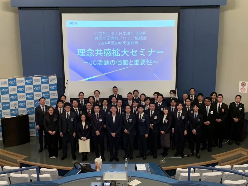 セミナー第1部では公益社団法人日本青年会議所2022年度理念共感拡大会議議長を務められた櫛田啓先輩から【理念を持って行動した未来(さき)には】【理念共感と会員拡大の関係とは】の2つをテーマにJCの理念に関してご講演していただき、第二部では2024年度宮城ブロック協議会会長佐藤健二君にもご参加いただき【JC活動の価値と重要性】をテーマにトークセッションが行われました。