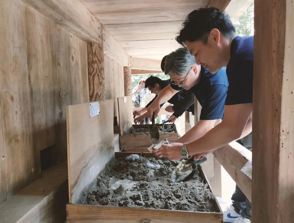 御砂が入った木箱が置かれているので、そこに稲佐の浜ですくってきた砂を納めてから、元からある乾いた御砂をいただきます。